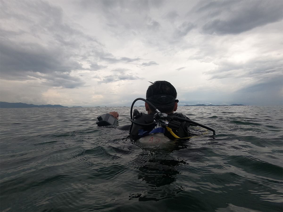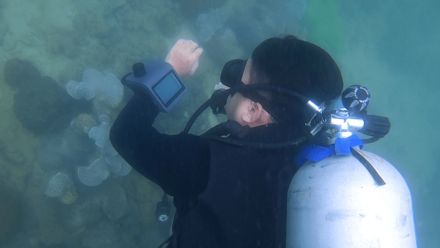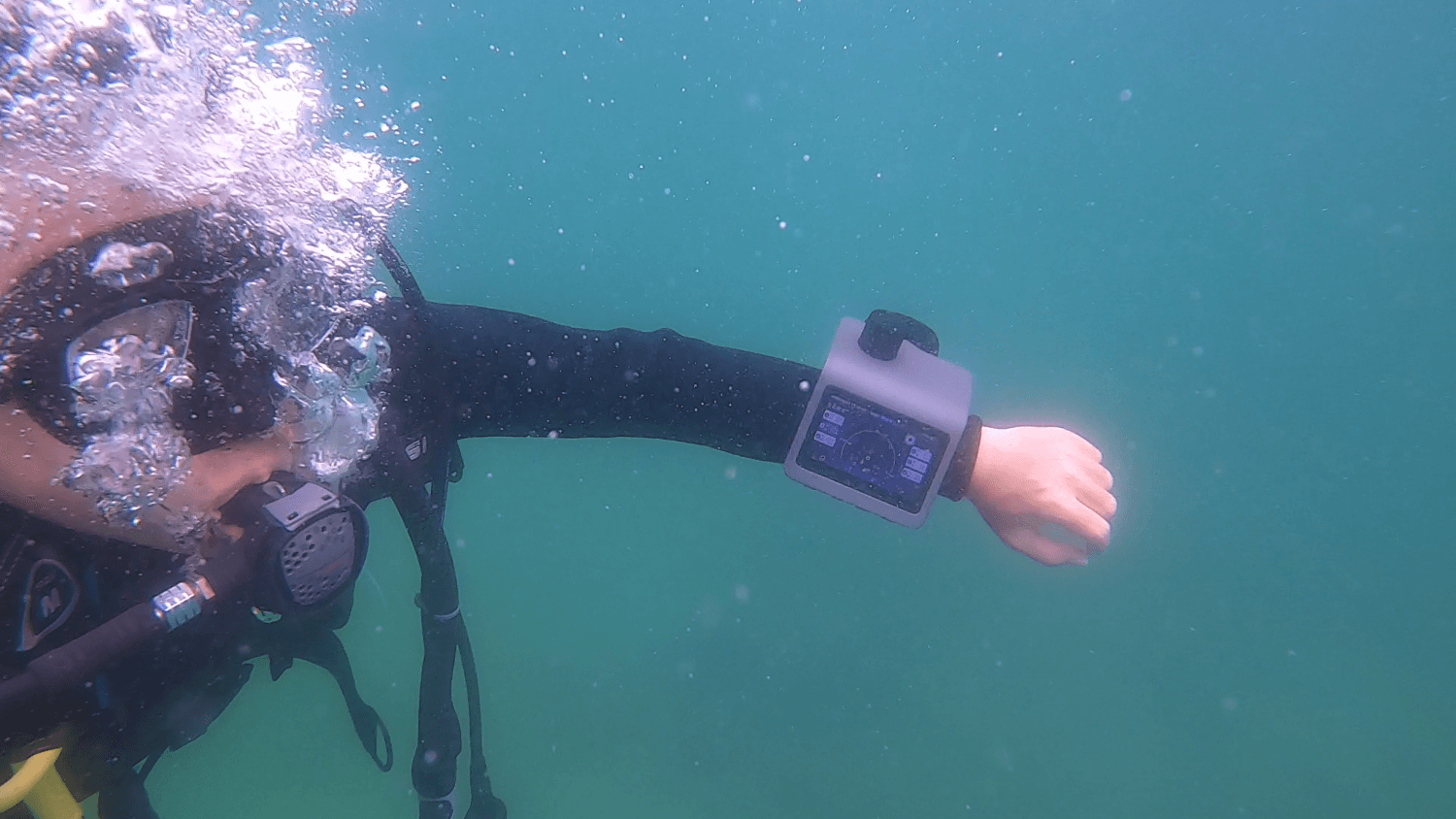 潛水員在深圳桔釣沙海域進(jìn)行潛水導(dǎo)航電腦Pro 的水下無線通信定位網(wǎng)絡(luò)組網(wǎng),實現(xiàn)人員之間的信息交互,相互實時定位等功能。
